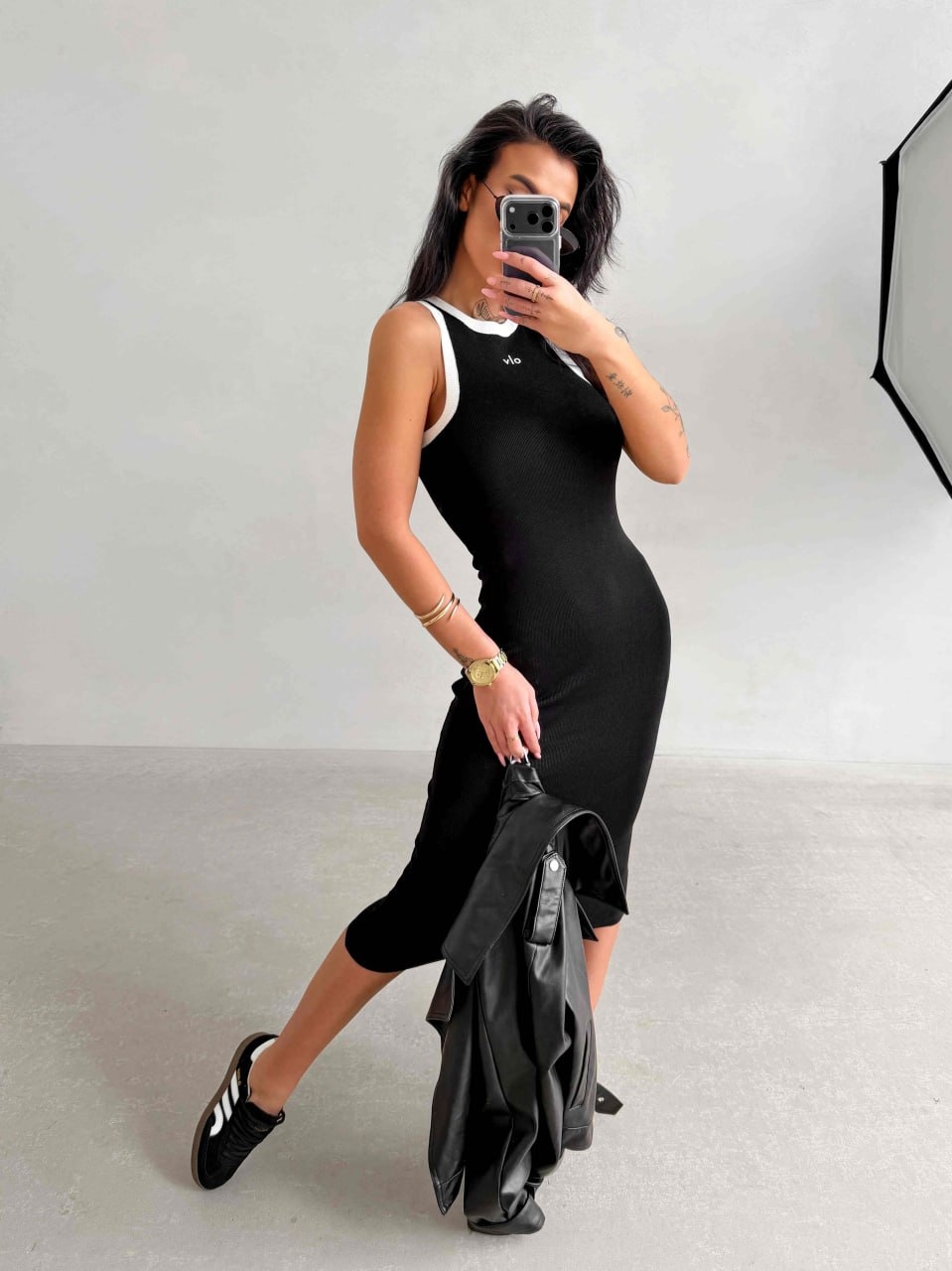 Testhezálló szabású, térd alá érő ruha halter nyakkivágással. Bordázott, rugalmas viszkóz anyagból készült, amely szépen követi az alakot. A dekoltázsnál kontrasztos szegély díszíti, míg a minimalista, 3D hatású logó modern megjelenést kölcsönöz.