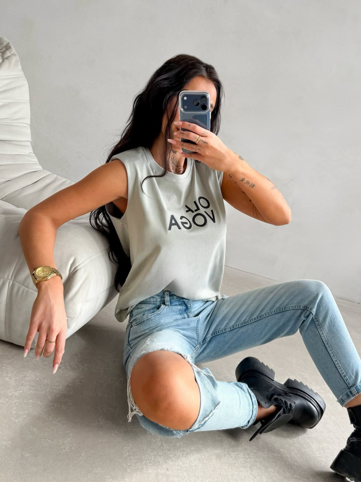 Laza szabású, ujjatlan felső magas minőségű pamut anyagból. Kerek nyakkivágással és bevarrt vállpárnákkal készült, amelyek hangsúlyos sziluettet adnak.